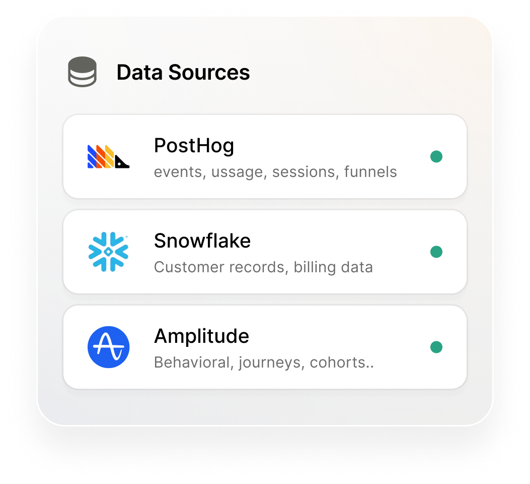 Swish connects to tools like PostHog, Mixpanel, or Snowflake to understand how users interact with your product.It reads every event - clicks, sessions, upgrades, drop-offs -and transforms them into structured insights ready for action.