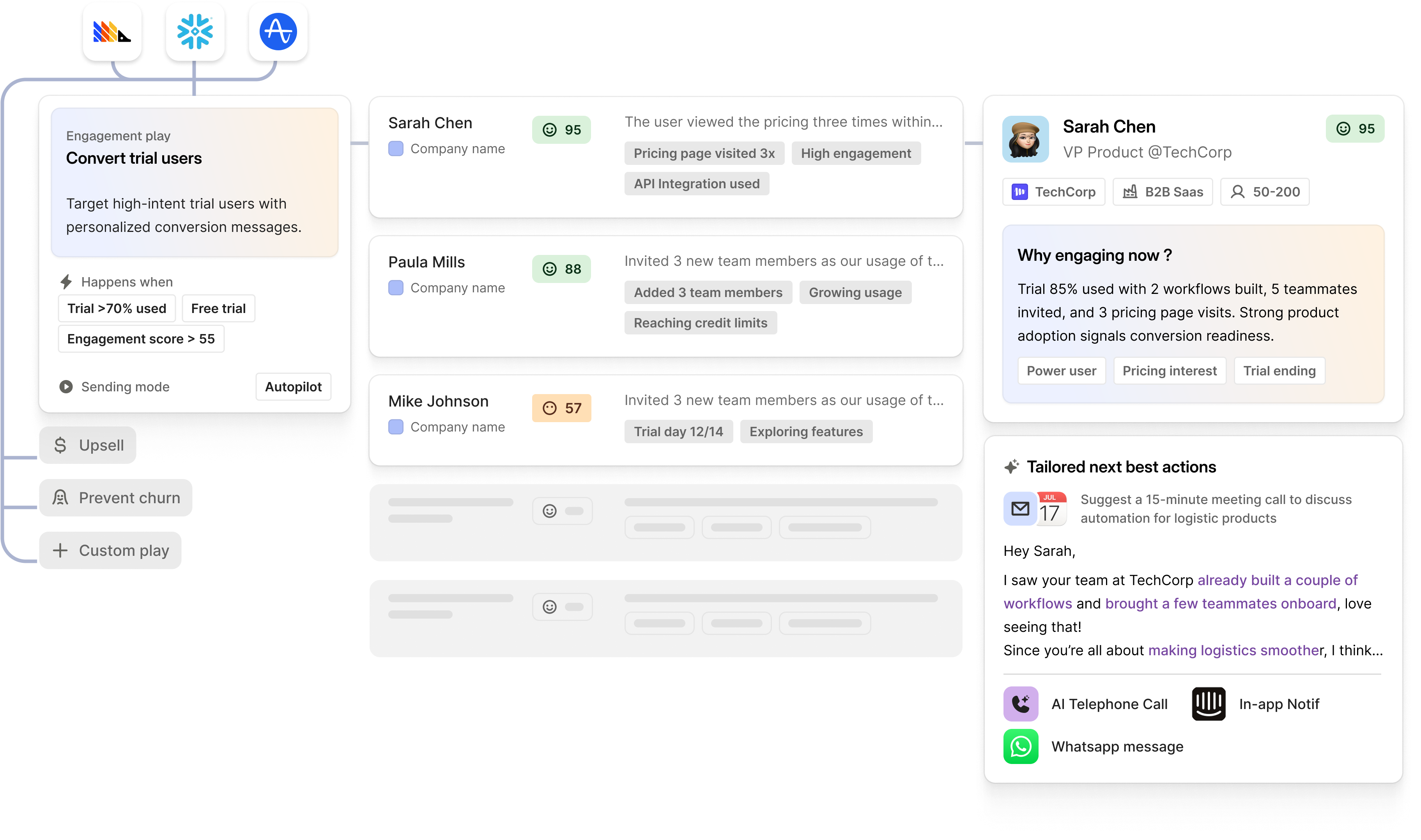 SWISH generates hyper-personalized engagement actions for the users involved - and sends them at the perfect moment on the right channel. Every message is contextual, grounded in behavior, role, company stage, and timing.